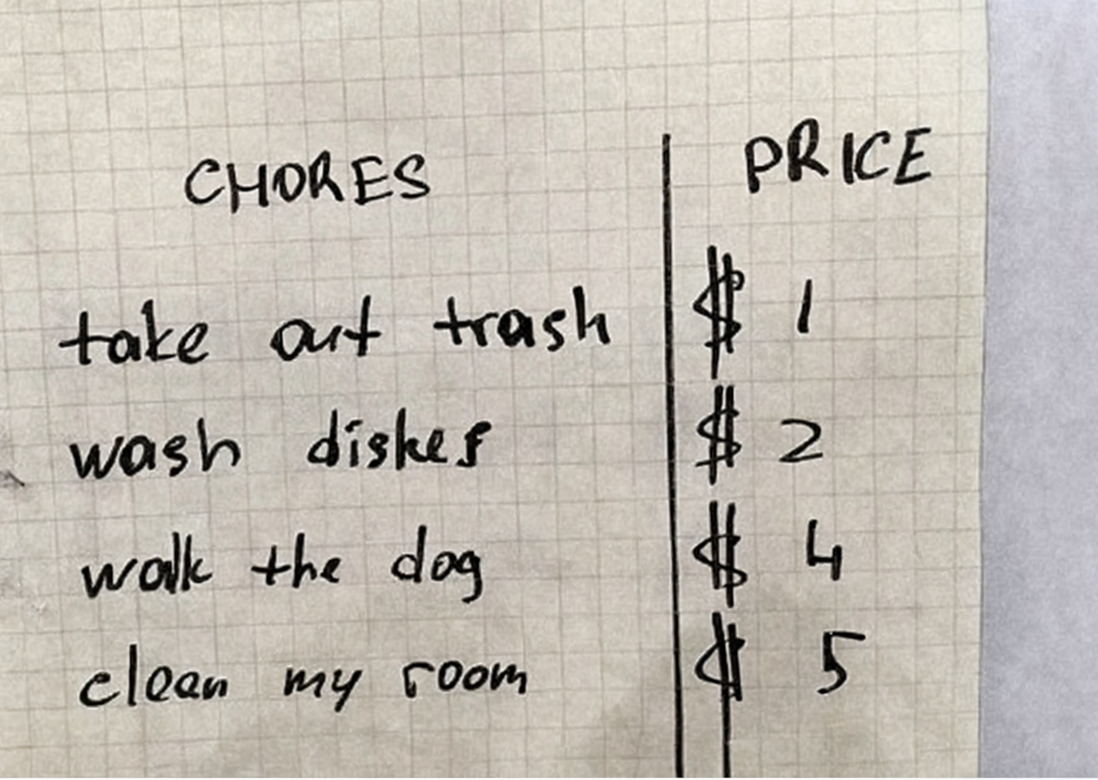 Wesley sourit triomphalement. « J’y ai réfléchi. Sortir les poubelles, 1 $, faire la vaisselle, 2 $, promener le chien, 4 $, ranger ma chambre, 5 $, et nettoyer la cour ou tondre la pelouse, 10 $. Et vous avez de la chance que je ne réclame pas un salaire rétroactif. »
