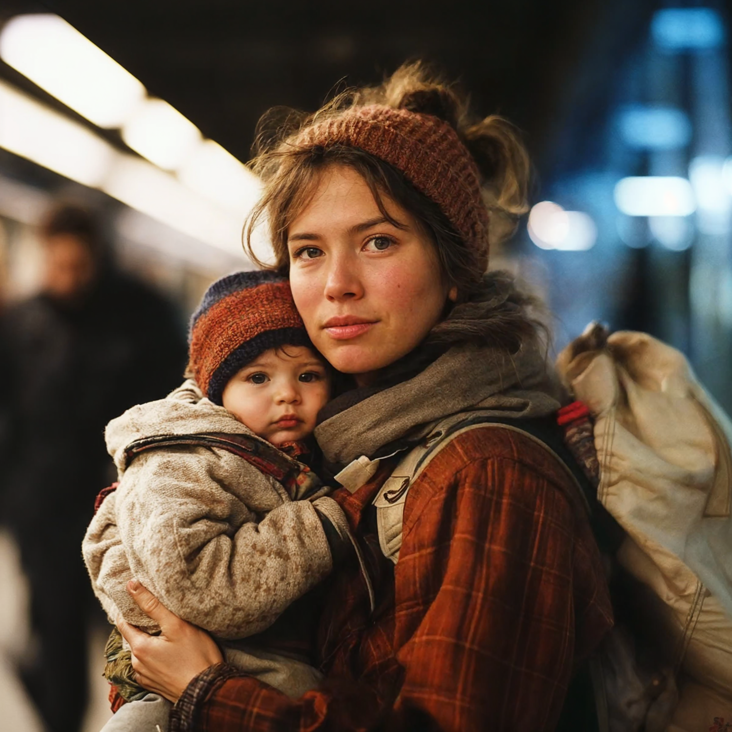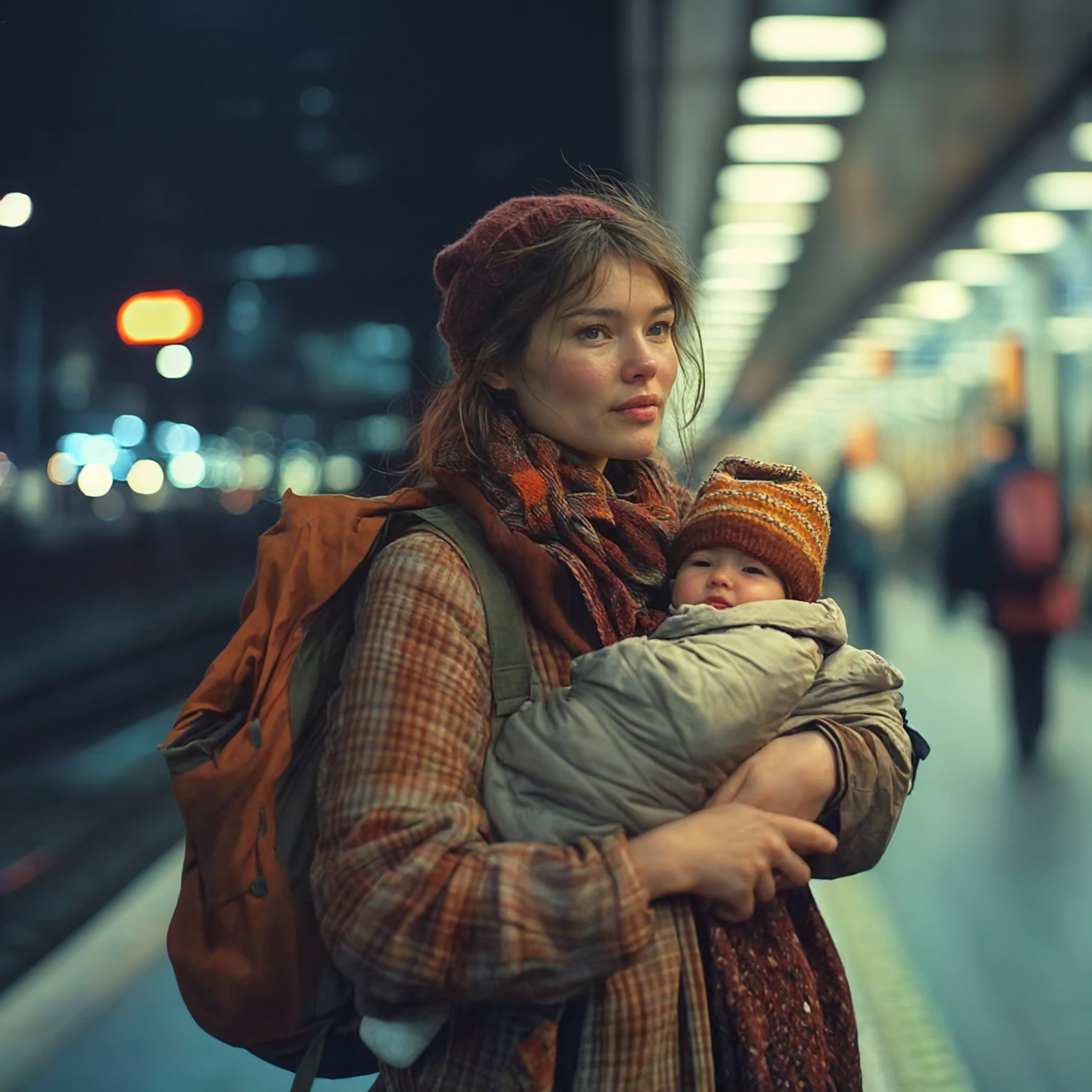 Alors qu’il se frayait un chemin dans la foule de la gare, il remarqua une femme tenant un bébé près de la sortie, sa silhouette partiellement enveloppée par la lumière froide du soir. Elle semblait déplacée, bien habillée mais usée, comme si elle n’avait pas prévu de passer sa journée là.