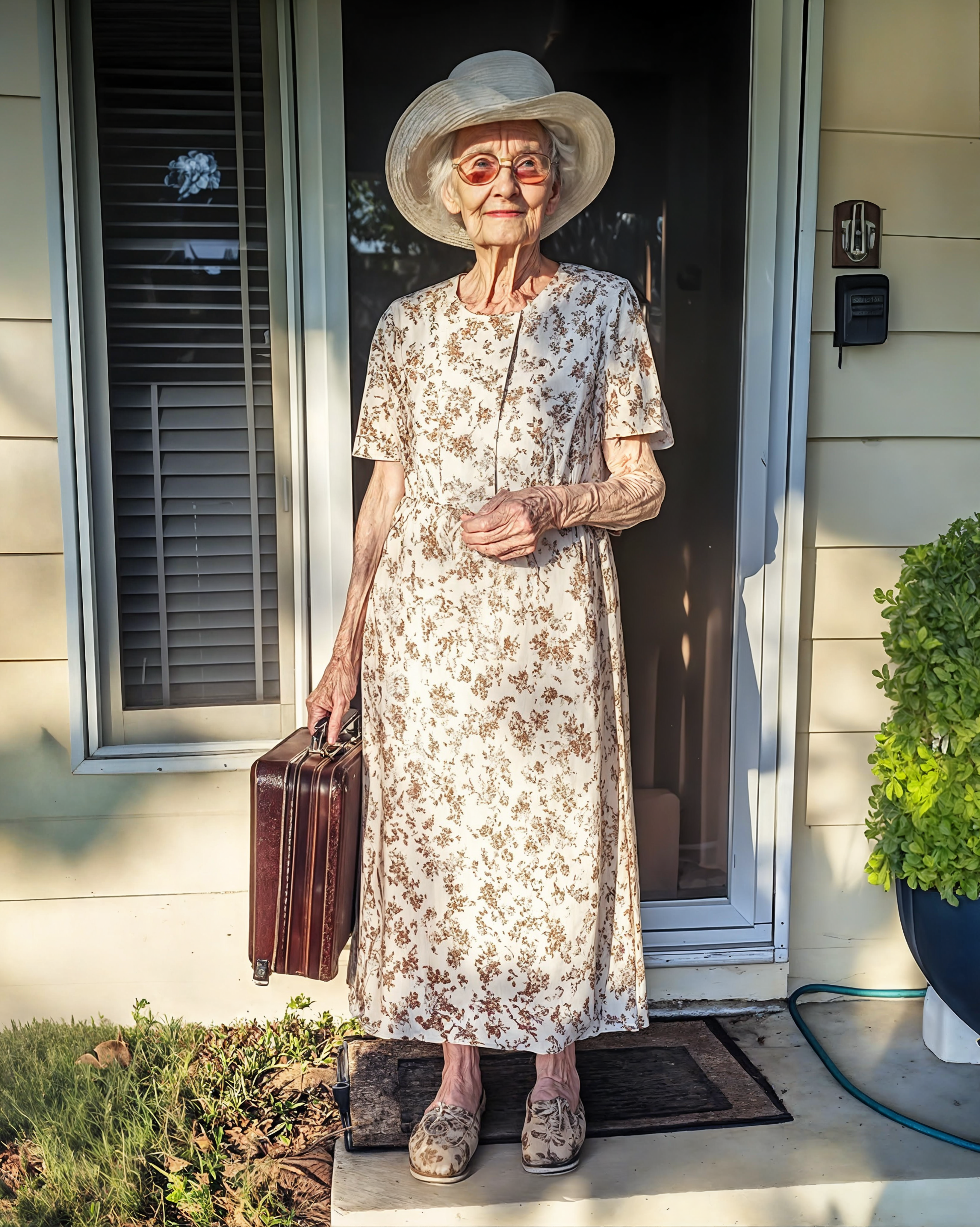 Elle portait un chapeau bleu pâle de style années 60 et une robe à fleurs assortie. Un collier de perles brillait doucement autour de son cou.