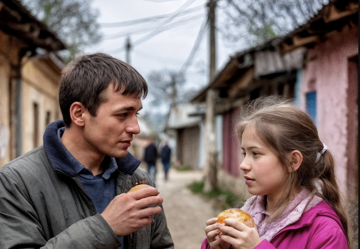 André ne put détourner les yeux. Ses jambes ralentirent d’elles-mêmes, son cœur se serra de douleur, et, malgré ses hésitations, il s’accroupit à côté d’elle. Il sortit le petit pain de sa poche et le lui tendit. La fillette sursauta, comme si elle était habituée à ce que le monde passe sans la voir. Puis, d’un geste timide, elle accepta le pain, ses petits doigts engourdis par le froid. Leurs regards se croisèrent, et André lut dans les siens la reconnaissance, l’étonnement et cette fragile confiance enfantine en la bonté du monde.