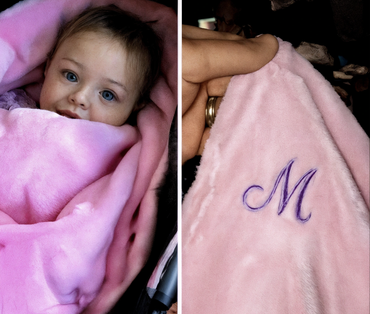 Et à cette couverture. Cette couverture rose toute fine avec un “M” brodé dans un coin.