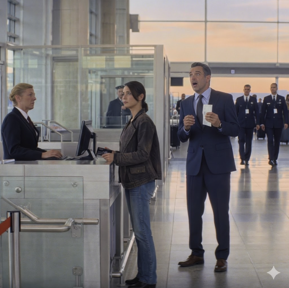 L’agent, Brenda, avait l’air épuisée. Elle a imprimé les cartes d’embarquement. Garrett les a distribuées comme un roi distribue des faveurs.