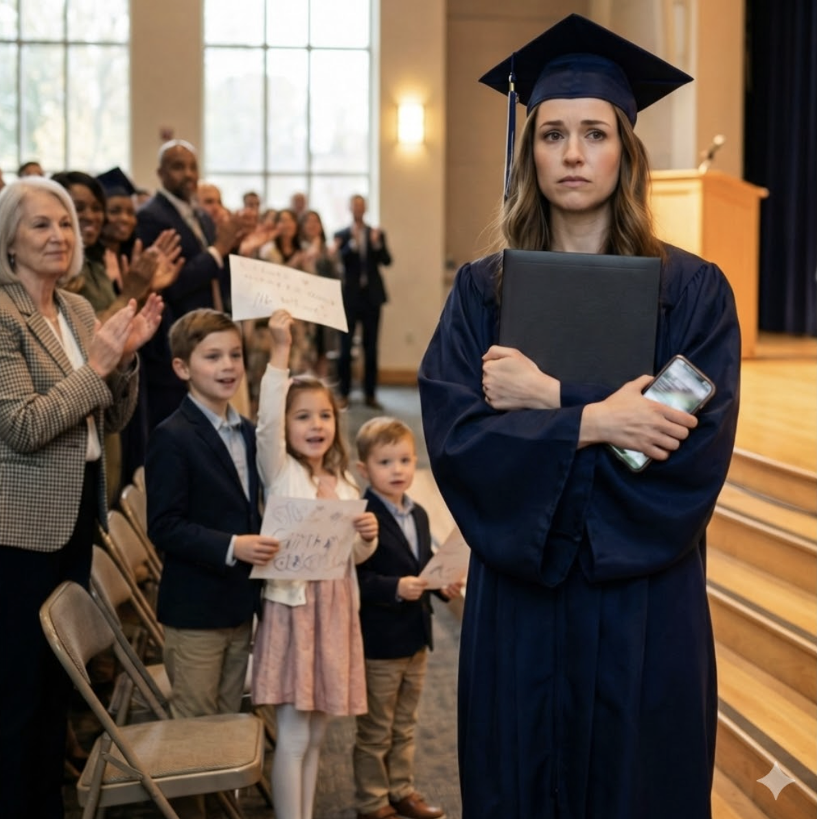 L’auditorium a explosé. Pas un petit rire poli : un vrai rugissement de joie contagieuse. Les gens se sont retournés pour voir trois enfants bondir, agiter des pancartes couvertes de paillettes comme si j’étais une rockstar. Les applaudissements ont gonflé, pleins, chauds. J’ai traversé la scène le cœur battant — pas de honte, pas de petitesse — mais une victoire qui avait un goût d’or.