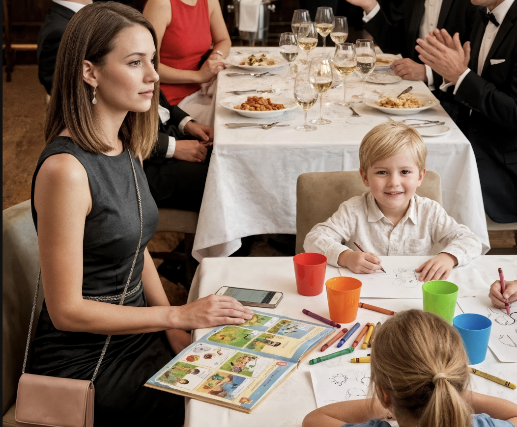 Je jetai un coup d’œil à la table du coin. Mon neveu Tyler, huit ans, y était déjà assis, balançant ses jambes et tapant énergiquement sur un jeu sur sa tablette. À côté de lui était ma nièce Sophia, qui venait d’avoir six ans. La table était dressée avec des gobelets en plastique décorés de personnages de dessins animés. Il y avait une pile de crayons de couleur au centre.